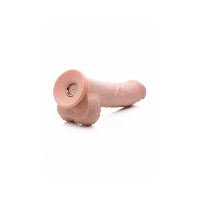 De huidskleur spuitende en vibrerende dildo met van XR Brands is niet alleen zeer realistisch in gebruik, maar voelt ook aan als een echte penis. Het TPR materiaal is zacht en comfortabel op de huid. De grote realistische eikel duwt zich een weg bij je naar binnen terwijl de geaderde schacht voor extra stimulatie zorgt. De balzak maakt het levensechte design helemaal af. Met een lengte van ruim 21 cm (16,75 cm inbrengbaar) en diameter van 4,5 cm zorgt de dildo voor een diep en vol gevoel. Met de draadloze afstandsbediening kun je gemakkelijk de 10 verschillende vibratiestanden regelen.
