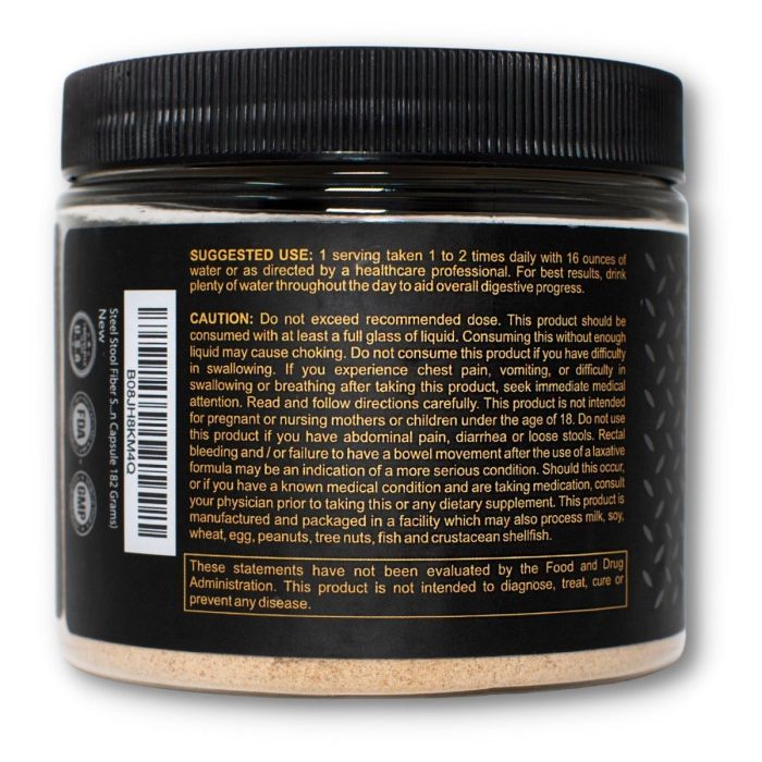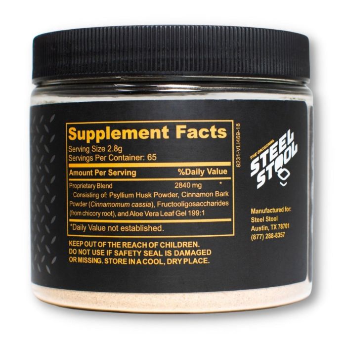 De Steel Stool poeder is een vezelsupplement dat speciaal is ontworpen voor mensen met een eiwitrijk dieet. Het bevat een unieke mix van 100% natuurlijke ingrediënten, waaronder Psylliumvezels, Kaneel, Cichorei en Aloë Vera, die helpen bij het behouden van spiermassa zonder de negatieve bijwerkingen van een slechte stoelgang. Neem één portie 1-2 keer per dag met een halve liter water voor de beste resultaten. Dit supplement verbetert de spijsvertering, verlaagt het risico op hartaandoeningen en ondersteunt een gezonde hartfunctie, helpt bij het voorkomen van katers en normaliseert en reguleert de dagelijkse stoelgang. Het is ook ideaal voor mensen die vatbaar zijn voor constipatie of dunne ontlasting en helpt bij het bereiken van een gezond, constant gewicht.