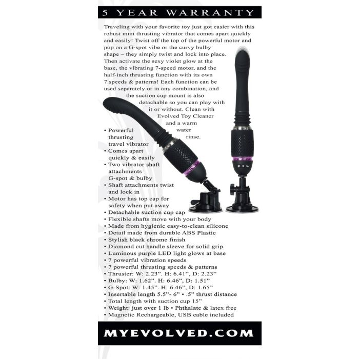 Laat je verwennen door deze Stotende Vibrator Thrust and Go van Evolved. Deze vibrator heeft alles in zijn mars om jou tot ongekende hoogtepunten te brengen. Met zijn 7 stotende standen en 7 vibratie standen kan jij heerlijk genieten van een solo sessie. Maar natuurlijk kan je ook samen met je lover genieten van deze toy. Laat hem zien hoe jij met jezelf bezig bent of geef de power allemaal in zijn handen en laat hem jou verwennen. Het diamant geslepen handvat zorgt voor een goede houvast zodat de vibrator ook bij een stevige sessie niet uit je handen glipt. Wanneer jij solo aan de gang wil gaan met de Thrust and Go gebruik je de meegeleverde zuignap. Deze zuignap zuigt zich onmiddelijk vast aan elke gladde en vetvrije ondergrond waardoor jij er met een gerust hart handsfree jouw kunstje op kan uitvoeren.