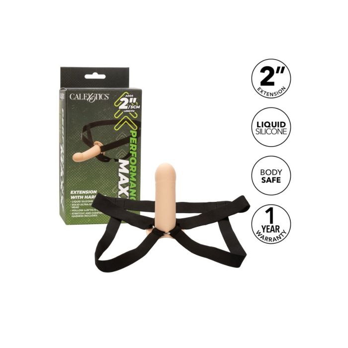 De Strap-On Harnas Met Sleeve Extension W van CalExotics is gemaakt van premium vloeibare siliconen extension is ongeparfumeerd, ftalaatvrij en onderhoudsvrij om je meest gevoelige plekjes gelukkig en gezond te houden. De sleeve is glad en hol. Hierdoor krijg jij 5 cm verlenging. De metalen ring houdt de sleeve stevig op zijn plaats, zelfs tijdens het meest krachtige neuksessie. Het meegeleverde harnas is ondersteunend met ultradikke taille- en dijbanden.