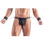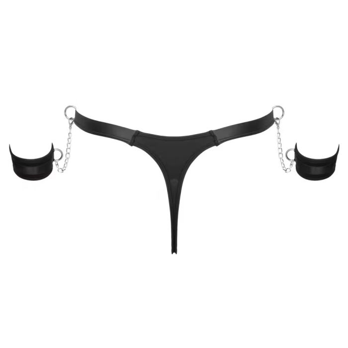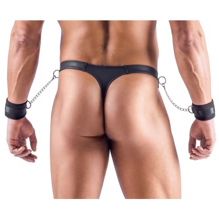Wat deze Rio string echt bijzonder maakt, zijn de bijpassende zachte handboeien die snel en eenvoudig kunnen worden vastgehaakt met hun karabijnkettingen. De tailleband is voorzien van ringen aan de voor- en zijkanten, waardoor je de handboeien in een handomdraai kunt bevestigen. De matte manchetten zijn niet alleen stijlvol, maar ook praktisch; ze zijn snel aan te trekken en verstelbaar met klittenband voor een perfecte pasvorm.