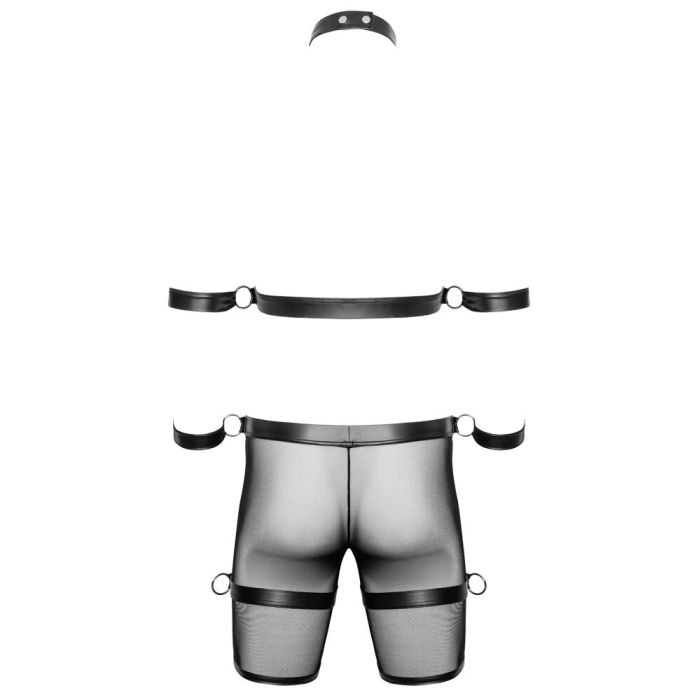 Het dijbeenharnas is een echte eyecatcher, vervaardigd uit verstelbare matlook bandjes die met drukknopen en ringen zijn bevestigd. Dit zorgt niet alleen voor een perfecte pasvorm, maar ook voor een speelse en uitdagende look. De verborgen ritssluiting aan de voorkant in het ondoorzichtige zakje voegt een extra element van mysterie toe, waardoor je partner niet kan wachten om te ontdekken wat eronder schuilgaat. Het borstharnas is eveneens ontworpen met verstelbare bandjes en ringen, wat zorgt voor een stevige en veilige grip, perfect voor een spannende avond.