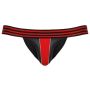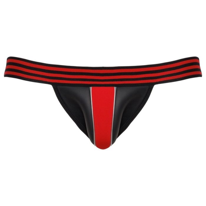Een stoere jockstrap van Svenjoyment in een extravagante zwarte neopreenlook met rode contrasten. Brede, comfortabele gestreepte elastische tailleband.