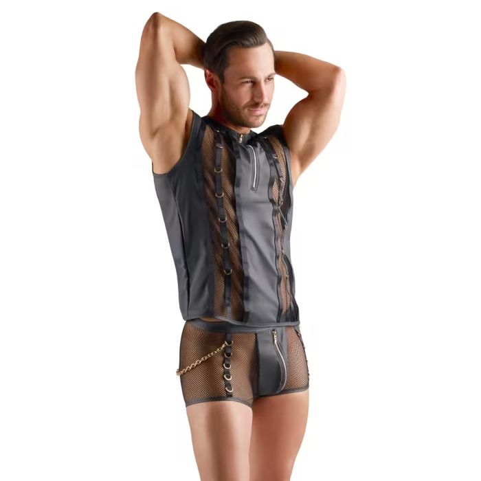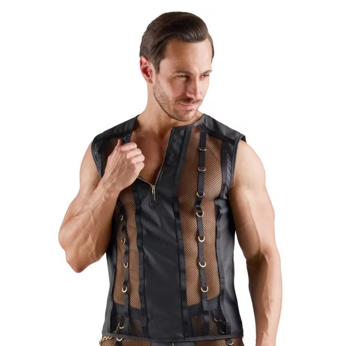Dit unieke shirt is vervaardigd uit een onthullend netmateriaal dat naadloos samengaat met een trendy wetlook, waardoor je een gedurfde en modieuze uitstraling krijgt. Het elastische en zachte materiaal voelt heerlijk aan op de huid, wat zorgt voor een ongeëvenaard draagcomfort. De goudkleurige korte ritssluiting aan de voorkant voegt een vleugje luxe toe, terwijl de decoratieve goudkleurige ringen aan de zijkanten en boven op de rug een speelse en verleidelijke touch geven.