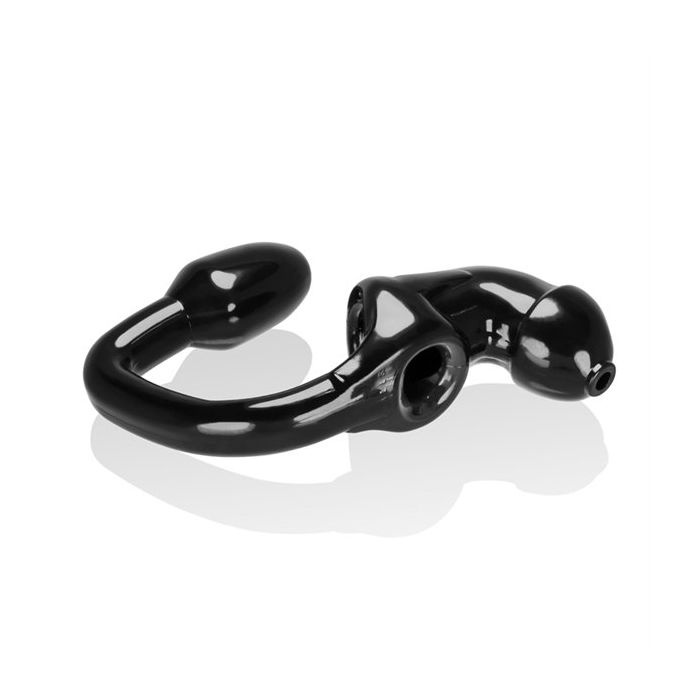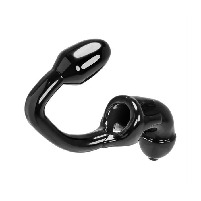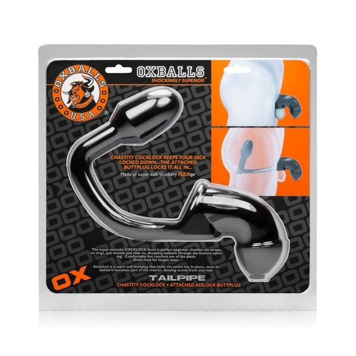 Schuif je penis in de sleeve en schuif de buttplug in je kontje. De Tailpipe kuisheidssleeve met buttplug van Oxballs is een twee in één seksspeeltje. Terwijl je lekker kunt genieten van anale stimulatie zorgt de Tailpipe ervoor dat je penis netjes op zijn plek blijft. De sleeve maakt het onmogelijk om rechtop te staan tijdens een erectie. Hierdoor is het perfect te gebruiken tijdens een kinky bdsm avondje. Het materiaal voelt heerlijk rekbaar aan en is dus makkelijk om de penis heen te brengen. Na gebruik is de toy makkelijk te reinigen met een milde zeep en een toycleaner.