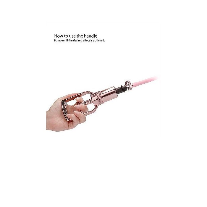 Met deze set zuig jij makkelijk je tepels of clitoris tot een hoger niveau. Gebruik deze pomp om op een eenvoudige manier je tepels en clitoris op te pompen door het cilinder op de gewenste erogene zone te plaatsen en in de pomp te knijpen tot jij het bloed nar die zone voelt stromen voor een overheerlijk gevoel. Ben jij iets te enthousiast geweest dan is dit makkelijk op te lossen door op het ontluchtingsventiel te drukken. Ontkoppelen van de slang is ook mogelijk zodat jij vrij rond kan lopen met de cups op de gewenste erogene zone. De set bestaat uit een handpomp met 3 cilinders, 2 voor de tepels en 1 voor je clitoris en een slang met twee uiteinden om je tepels tegelijk op te kunnen pompen. De cilinders zijn transparant, de slang is roze en de handpomp is rosé goud voor een vrouwelijke uitstraling.