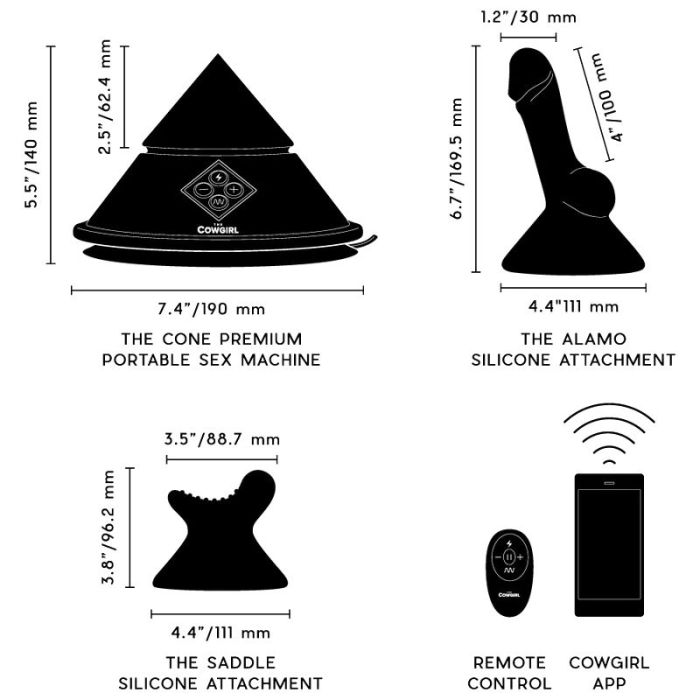 De Cowgirl Cone set wordt geleverd met een USB-oplaadsnoer, een gebruikershandleiding, een draadloze afstandsbediening, de Saddle Attachment voor externe stimulatie van de clitoris en vulva, en de Alamo Attachment voor penetrerend genot. Met deze accessoires kun je je ervaring aanpassen en genieten van een scala aan sensaties.
