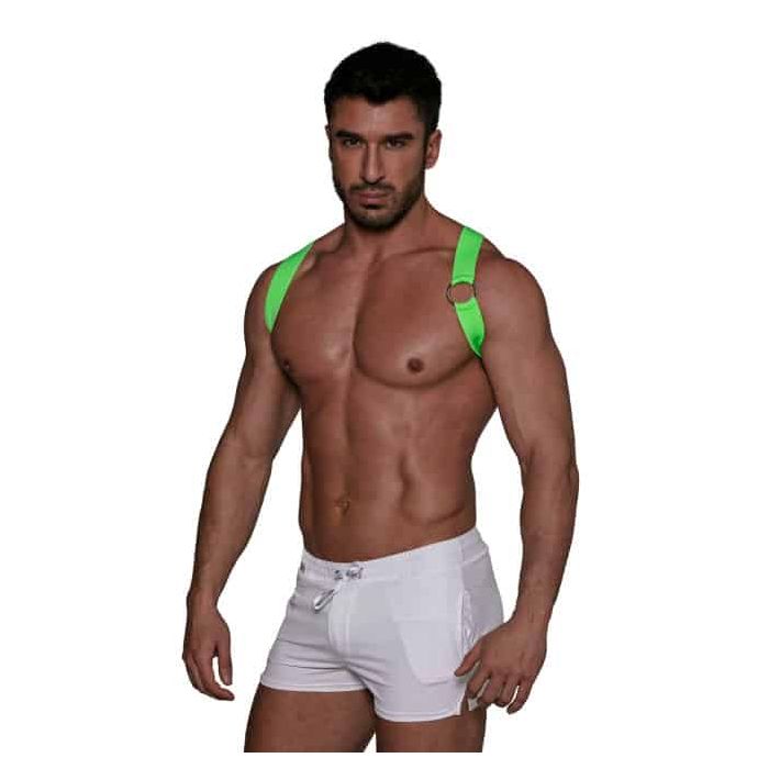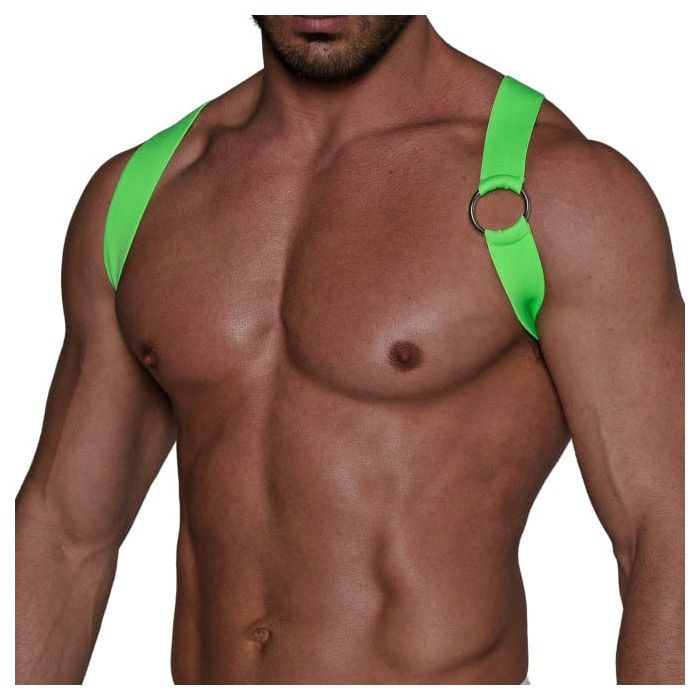 Laat jouw gespierde schouders nog breder lijken in het TOF Paris Party Boy Harnas - Neon Groen. Dit harnas is geheel gemaakt van elastische banden. Op de achterkant is het TOF embleem aangebracht. Het harnas heeft op de rug een X-model voor een comfortabele pasvorm en geaccentueerde schouders.
