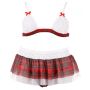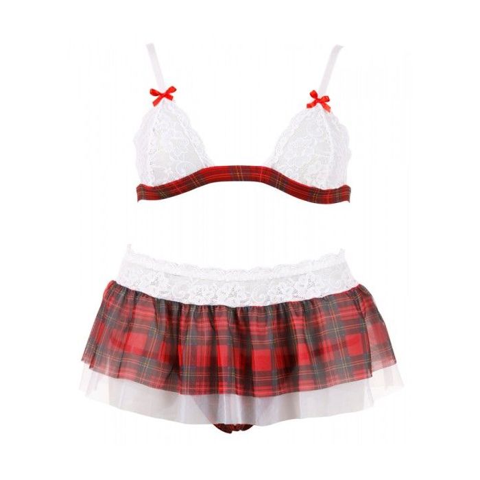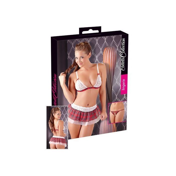 Verras je partner eens door je te verkleden als een stout schoolmeisje in dit ondeugende lingerie setje van Cottelli Collection. Deze set bestaat uit een bh, een heel kort rokje en een string. De bh is gemaakt van maagdelijk wit kant en is afgewerkt met een rood geruite band en lieve rode strikjes. De schouderbandjes zijn verstelbaar en de bh heeft een klik sluiting achter. Het rokje is gemaakt van een maagdelijk witte tailleband van kant en geplooid rood geruite stof, met daaronder wit tule. Onder het rokje kan de string van rood geruite stof gedragen worden. De string heeft een open kruisje voor stoute spelletjes. Het korte rokje is ideaal voor spanking.