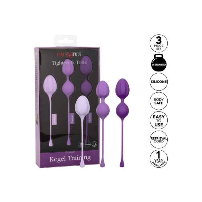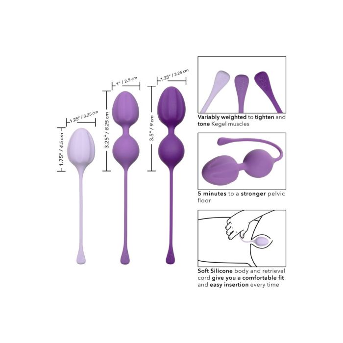 Met deze Training Set Kegel verstevig je de bekkenbodemspieren in slechts 5 minuten per dag. Door 3 trainings kegels om de trainingsintensiteit en het seksuele genot geleidelijk te verhogen. De 3-delige set bevat een 55 g, 75 g en 95 g en een volledige trainingsroutine. Terwijl de gewichten werken om seksuele opwinding te vergroten, zijn ze ontworpen om de bekkenspieren zachtjes te versterken. Door die belangrijke liefdesspieren te trainen, verminderde je het risico op bekkenbodemaandoeningen of incontinentie. Door de handige trekkoord zijn ze eenvoudig te verwijderen. De set is gemaakt van hygiënisch superieure siliconen. Maak de set na gebruik goed schoon met een toycleaner.