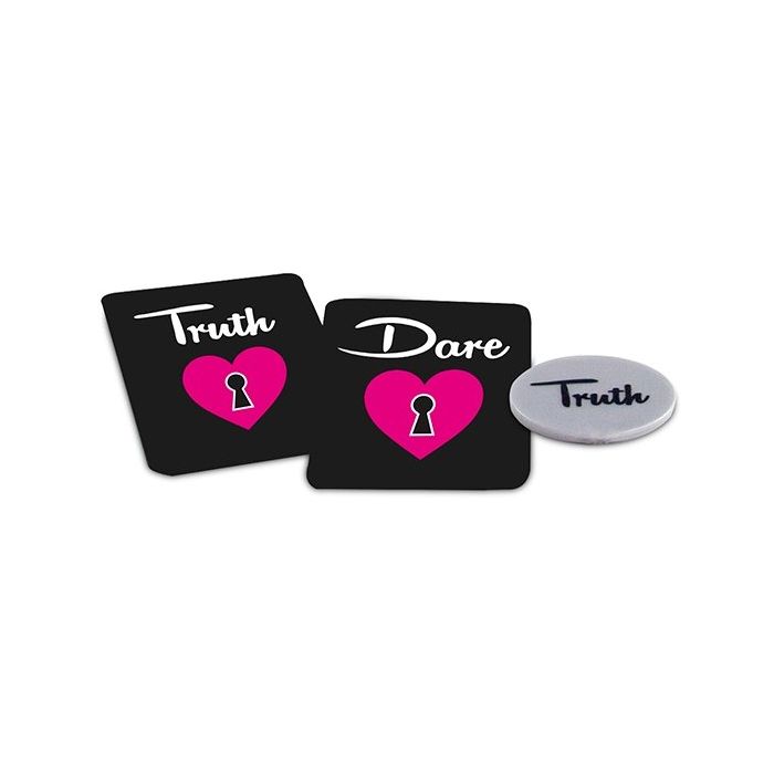 Bepaal met behulp van de Truth or Dare flip coin welke kaart je moet pakken. Bij een Truth-kaart verdien je alleen punten met een eerlijk en gedetailleerd antwoord. Bij een Dare-kaart krijg je punten als je de spannende opdracht volbrengt. Het aantal hartjes op elke kaart bepaalt het aantal punten dat je kunt verdienen. Wil je de vraag niet beantwoorden of opdracht echt niet doen? Geen probleem, maar dan worden de punten bij jou in mindering gebracht. Alles mag, maar niets moet. Hoe ver durven jullie te gaan?