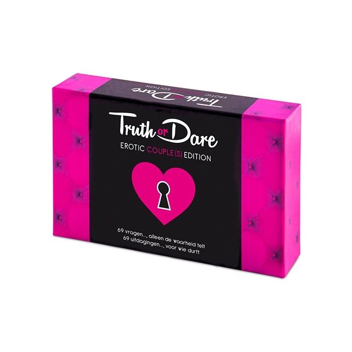 Voor een nacht vol spanning en voorspel ga jij voor dit geweldige Truth or Dare Spel Erotic Couple(s) Edition. Het spel bevat 69 uitdagende en zeer persoonlijke vragen en opdrachten op erotisch gebied. Het spel is bedoeld voor 1 stel, maar doe eens gek en voeg er een stel aan toe........Durf jij bij het krijgen van een opdracht de partner van de ander te kiezen?