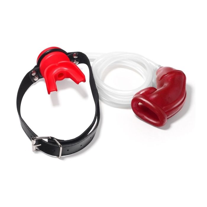 Dit accessoire is ontworpen voor degenen die hun onderdanige willen laten drinken van hun urine. Het bestaat uit een flexibele kooi van siliconen die op de penis wordt geplaatst en een knevel met een flexibele slang van 1 m die de urine naar de mond brengt en zuigkracht mogelijk maakt. De kooi heeft afmetingen van ongeveer 10 x 4 cm en de verstelbare band kan worden aangepast van 43 tot 61 cm.