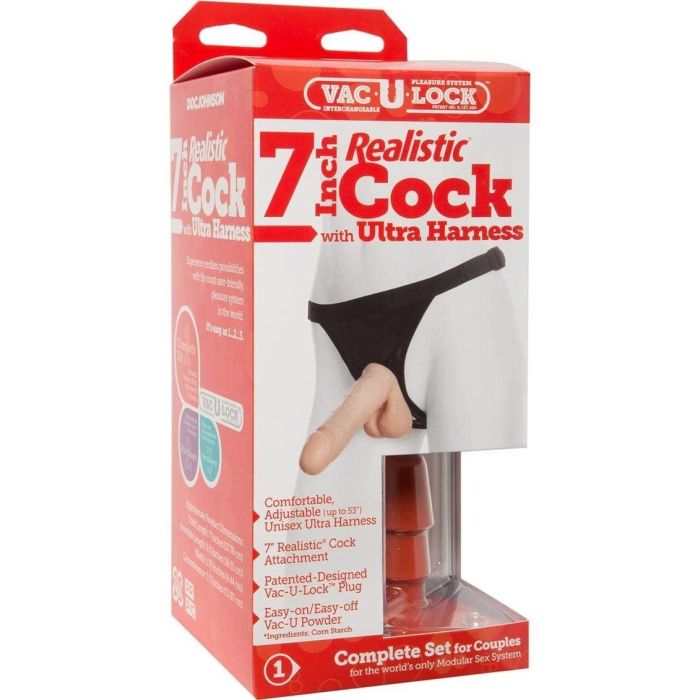 Geniet samen van deze kwalitatieve dildo met harnas van Doc Johnson. Ideaal voor stellen die elkaar ultiem genot gunnen. Het verstelbare harnas is prettig om te dragen, past altijd en biedt jullie de mogelijkheid om eindeloos te variëren. Het is namelijk uitgerust met het Vac-U-Lock systeem waardoor het te combineren is met elke Vac-U-Lock dildo. De bijgeleverde huidskleur dildo heeft alle kenmerken van een echte penis en voelt daardoor zeer realistisch aan. De dildo is 18 cm lang en heeft een diameter van 3,9 cm. Hiermee weet hij alle gevoelige plekjes makkelijk te vinden. Gebruik de Vac-U-Lock voorbind dildo met harnas met voldoende glijmiddel op waterbasis en maak hem na gebruik eenvoudig schoon met wat water en toycleaner.