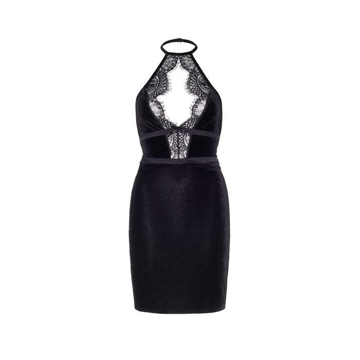 Rondom de taille zijn 2 fluwelen stroken aangebracht voor een stijlvol effect. De Velvet Backless Halter Dress heeft een strik sluiting in de nek en een blote rug. In dit korte en strakke jurkje ben jij zeker het mooist gekleed op ieder feest of thuis in de slaapkamer.