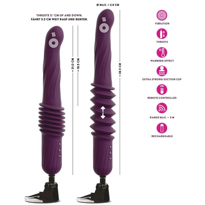 De RC Warming Fucking Machine van You2Toys is een krachtige schokvibrator die je zintuigen op een ongekende manier prikkelt. Met zijn unieke golfstructuren en afneembare zuigvoet, die je in een hoek van 90° kunt verstellen, biedt deze vibrator een handsfree ervaring die je niet snel zult vergeten. Bevestig hem eenvoudig aan elk glad oppervlak en laat je meevoeren door de krachtige stoten en vibraties. Met een slaglengte van 5,5 cm en drie instelbare snelheden, kun je de intensiteit perfect afstemmen op jouw wensen. De 10 verschillende vibratiestanden zorgen voor een scala aan mogelijkheden, allemaal eenvoudig te bedienen met de afstandsbediening tot 8 meter afstand of met één druk op de knop op het speeltje zelf.