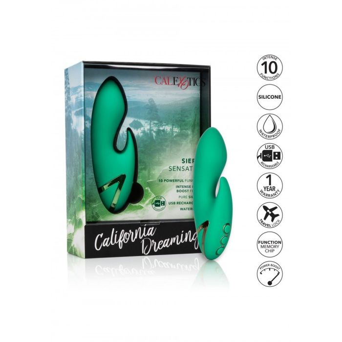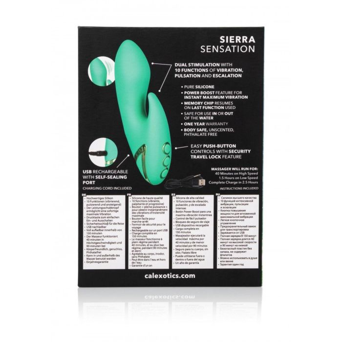 Deze vrolijke groene tarzan rabbit vibrator gaat graag overal met jou mee naartoe om samen spannende avonturen te beleven. De Sierra Sensation vibrator van California Exotic heeft met een lengte van 13 cm en diameter van 3,25 cm een mooi compact formaat en is daarmee een ideaal metgezel op reis. De vorm van de schacht biedt heerlijke inwendige sensaties terwijl de clitorisstimulator jouw clitoris optimaal verwent. Ontdek alle 10 vibratiestanden en geniet van heerlijk hoogtepunten. Sierra Sensation is gemakkelijk te bedienen met het push button systeem en dankzij het zijdezachte materiaal voelt de vibrator heerlijk aan tegen de huid. De vibrator is volledig waterproof, dus je kunt hem niet alleen mee op reis nemen, maar ook mee in bad. Laad hem na gebruik makkelijk weer op met de bijgeleverde kabel.
