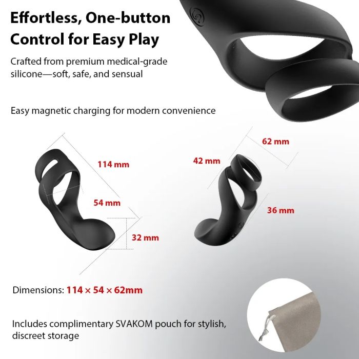 De vibrerende cockring Benedict van Svakom heeft een sterke motor die zorgt voor intense trillingen en het perineum stimuleert terwijl het orgasme wordt uitgesteld. Het siliconen materiaal voelt ultrazacht en comfortabel aan. De cockring heeft 5 verschillende vibratiestanden en 5 intensiteitsniveaus. Wanneer de cockring leeg is laad je hem eenvoudig met de meegeleverde USB oplaadkabel.