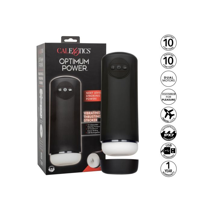 Ervaar het ultieme genot met de Optimum Power Vibrating and Thrusting Stroker, een oplaadbare masturbator die beschikt over 10 verschillende functies van trilling, pulsatie en escalatie. Daarnaast biedt deze masturbator ook 10 onafhankelijke stotende functies, zodat je kunt genieten van een gepersonaliseerde voldoening.