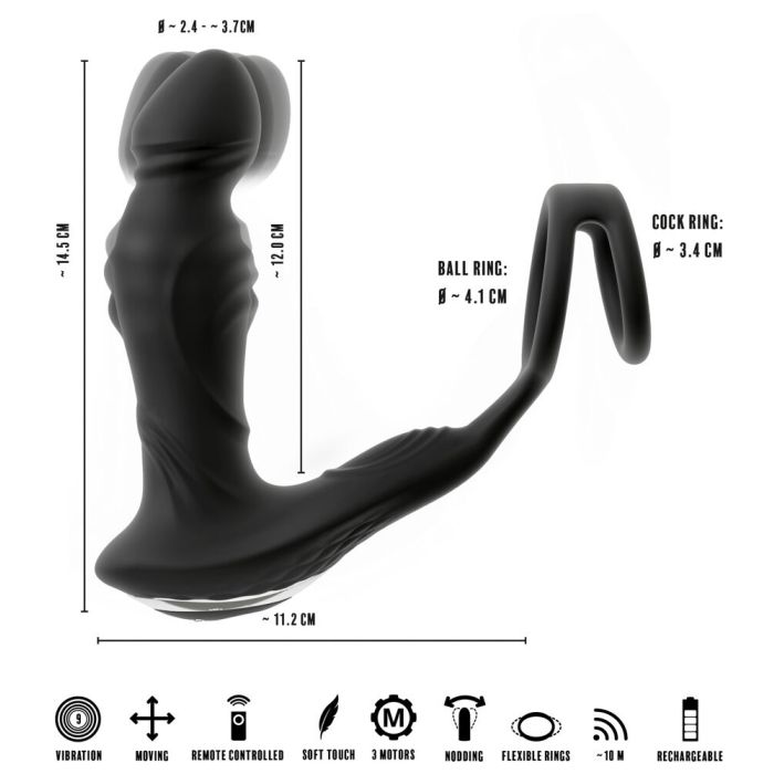 De RC Vibrerende Prostaatplug van Rebel is ontworpen voor intense anale stimulatie! Deze innovatieve speeltje combineert een geavanceerde prostaatvibrator met een perineum-oplegvibrator en penis-/testikelringen, waardoor je zowel van binnen als van buiten wordt verwent. De knikkende vibrerende tip stimuleert je prostaat op een unieke manier, terwijl de bewegende ringen het anale kanaal masseren en de trillingen je perineum een tinteling geven. Met maar liefst 3 krachtige, stille motoren en 19 verschillende standen, kun je de perfecte combinatie van trillingen en massages vinden die bij jou past. Ergonomisch gevormd en gemaakt van hoogwaardig siliconen, biedt deze prostaatplug maximaal comfort en ondersteuning voor je erectie. De afstandsbediening maakt het eenvoudig om solo of met een partner te genieten van dit intensieve anale plezier. Oplaadbaar met een USB-kabel en inclusief batterij voor de afstandsbediening, is dit speeltje de perfecte aanvulling op je slaapkameravonturen!