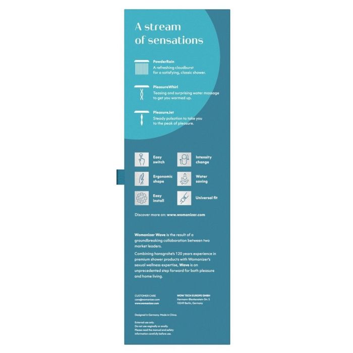 Geniet jij ook het liefst onder de douche of in bad? Dan is de Womanizer Wave van het merk Womanizer perfect voor jou! De wave is een ergonomisch perfect ontworpen multifunctioneel douche-opzetstuk met gepatenteerde PleasureJet technologie. Hansgrohe en Womanizer hebben hun krachten gebundeld, en zo ontwikkelden de twee Marktleiders op het gebied van badkamerexpertise en seksspeeltjes de Womanizer Wave intieme douchekop.