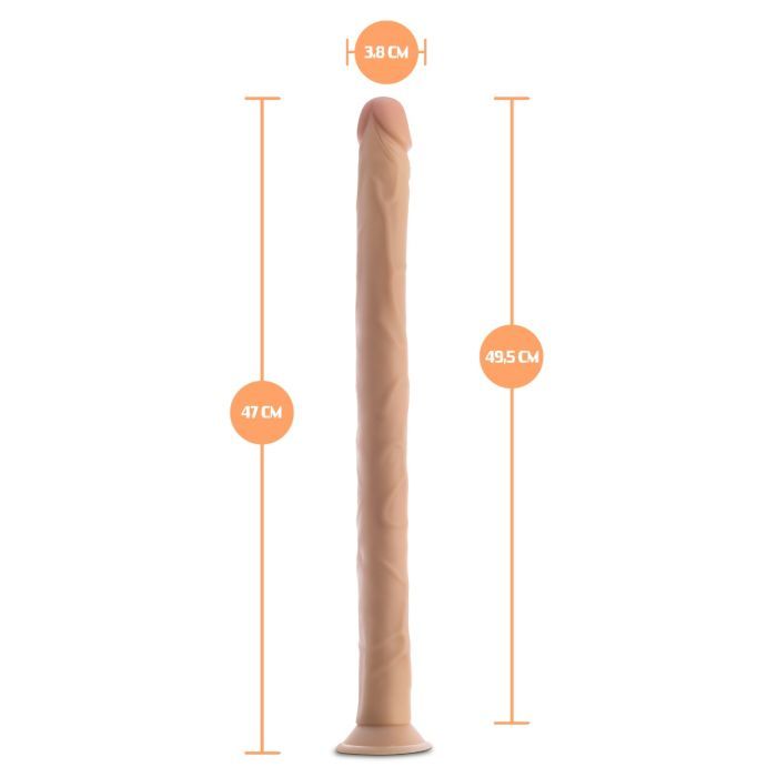 Deze XXL dildo betreft en extra lang model dat speciaal gemaakt is voor diepe anale penetratie. De dildo is gemaakt van buigzaam PVC en is met behulp van voldoende glijmiddel eenvoudig in te brengen. De dildo is prachtig gedetailleerd en heeft alle kenmerken van een echte penis. Met behulp van zijn sterk zuignap zet je de dildo eenvoudig vast op een vlakke ondergrond om vervolgens handsfree te kunnen genieten van jouw nieuwe aanwinst. Tip: voor optimaal genot en hygiëne raden wij aan om een flesje glijmiddel en toycleaner bij te bestellen.