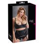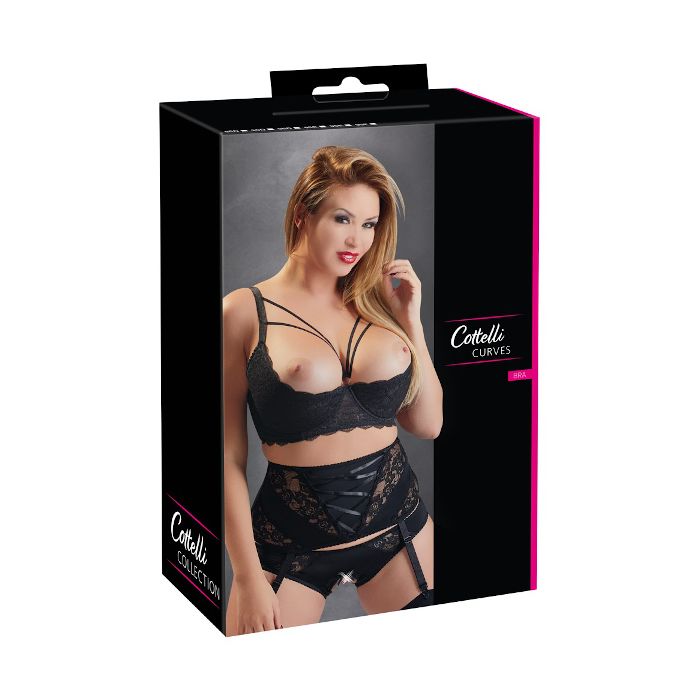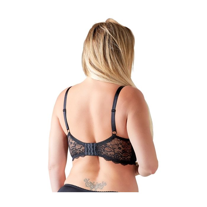 Maak je lover wild met deze schitterende zwarte beha met open cups en dubbele sierbandjes die mooi om de borsten heen lopen. Deze beha heeft zachte paddings en een beugel zodat hij de borsten iets zal liften en hij is afgewerkt met het mooiste kant voor een luxe uitstraling. In het midden, tussen de borsten zit een zilveren ring waaraan 4 touwtjes zijn bevestigd die boven de borsten langs lopen en eindigen aan de verstelbare bandjes die over de schouders heen lopen. Dit maakt deze beha helemaal af. Hij sluit aan de achterkant met 3 haaksluitingen die tot het derde haakje is te verstellen voor de juiste pasvorm. De bandjes over de schouders zijn ook verstelbaar. Draag bij deze mooie open beha een sexy jarretel gordel en sexy kousen en jij bent verzekerd van een wilde en hete nacht, jouw lover kan namelijk niet meer van je afblijven.