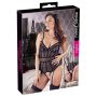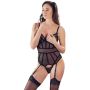 De Zwarte Jarretel Body met Afneembaar Kruis is een figuur flatterende body gemaakt van doorschijnend tule. De velours stroken die over de body lopen laten je taille smaller lijken. De body heeft verstelbare schouderbandjes, afneembare en verstelbare jarretelbandjes en een afneembaar kruis met string model.