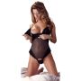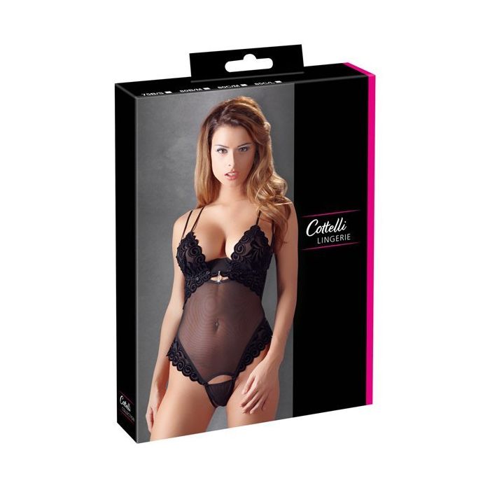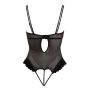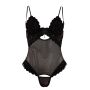 Ben jij in een ondeugende bui en wil je graag je partner verleiden? Dan is deze String Body echt iets voor jou. Deze nauwsluitende, semi-transparante body laat precies genoeg zien zodat ook de fantasie nog behoorlijk geprikkeld wordt. Met zijn dubbele, verstelbare bandjes is deze string body heel gemakkelijk passend te maken. De prachtig versierde soft cups zijn afneembaar zodat je heerlijk kunt teasen. Onder de soft cups zitten liftende kwart cups voor een zeer erotisch uiterlijk. De cups en zijkanten van de body zijn versierd met zwart flock print en tussen de cups zijn stras steentjes aangebracht voor een luxueuze uitstraling. Het kruisje van de string is net als de cups afneembaar, dus wanneer jouw partner je geplaag zat is kan hij direct tot actie over gaan.